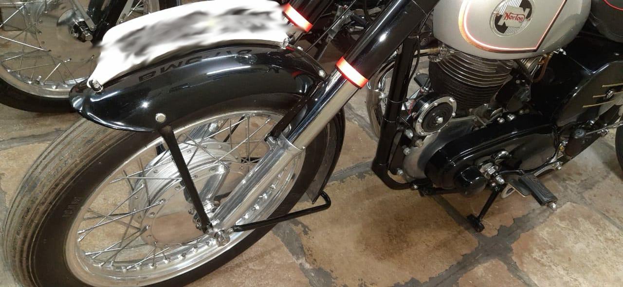 The chassis is attached to Norton’s Roadholder telescoping front fork and the laced front wheel sports 8 x 1.25-inch mechanical drum brakes and 3.00 x 19 tires.