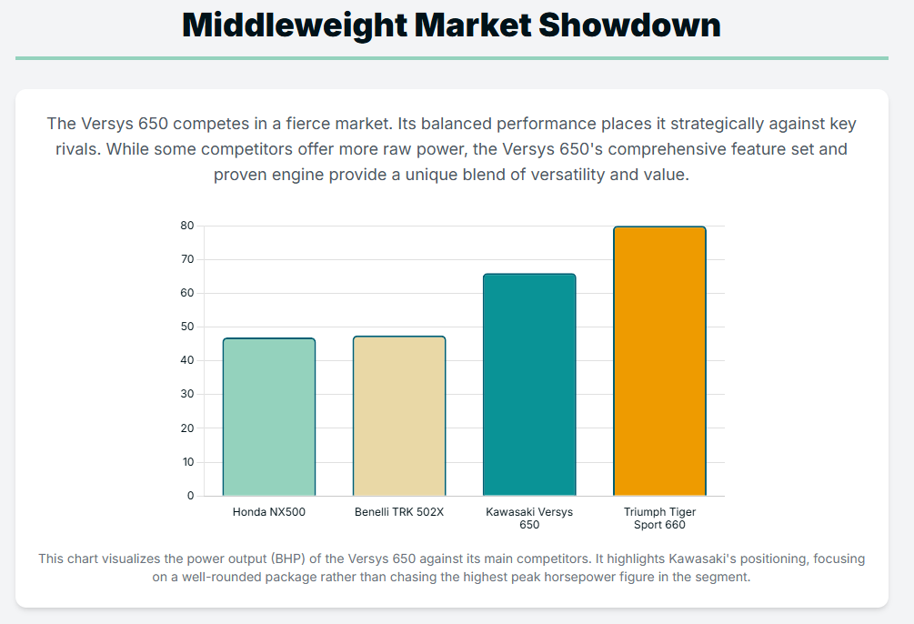 The Versys 650 operates within a crowded segment, facing competition from a range of motorcycles that offer varying blends of performance, features, and price points. Key competitors include: