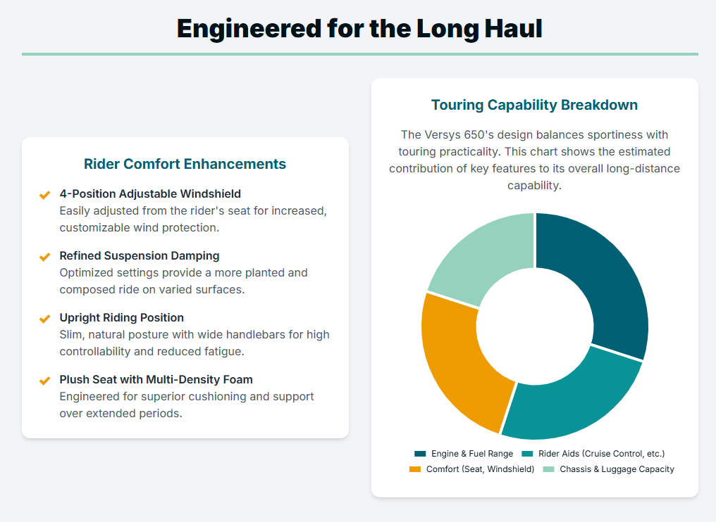 Further contributing to its long-haul capabilities, the seat of the 2026 Versys 650 features “different densities of foam”.11 This multi-density foam construction is engineered to provide superior cushioning and support, effectively mitigating rider discomfort and fatigue over extended periods in the saddle. This attention to detail reinforces the Versys 650’s strong touring credentials.