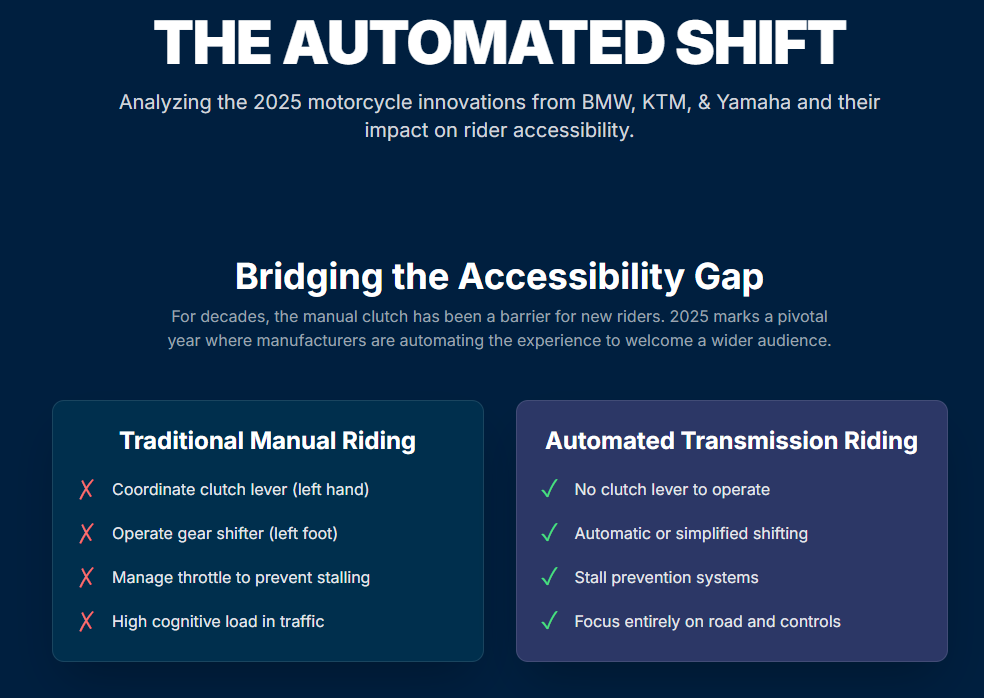 The introduction of automatic transmission systems by major manufacturers like BMW, KTM, and Yamaha in their 2025 motorcycle lineups directly addresses a strategic imperative: enhancing accessibility to a wider audience . This push for increased accessibility is a direct response to evolving market dynamics, including an aging rider demographic and the need to attract new participants who may be intimidated by the complexities of manual shifting.