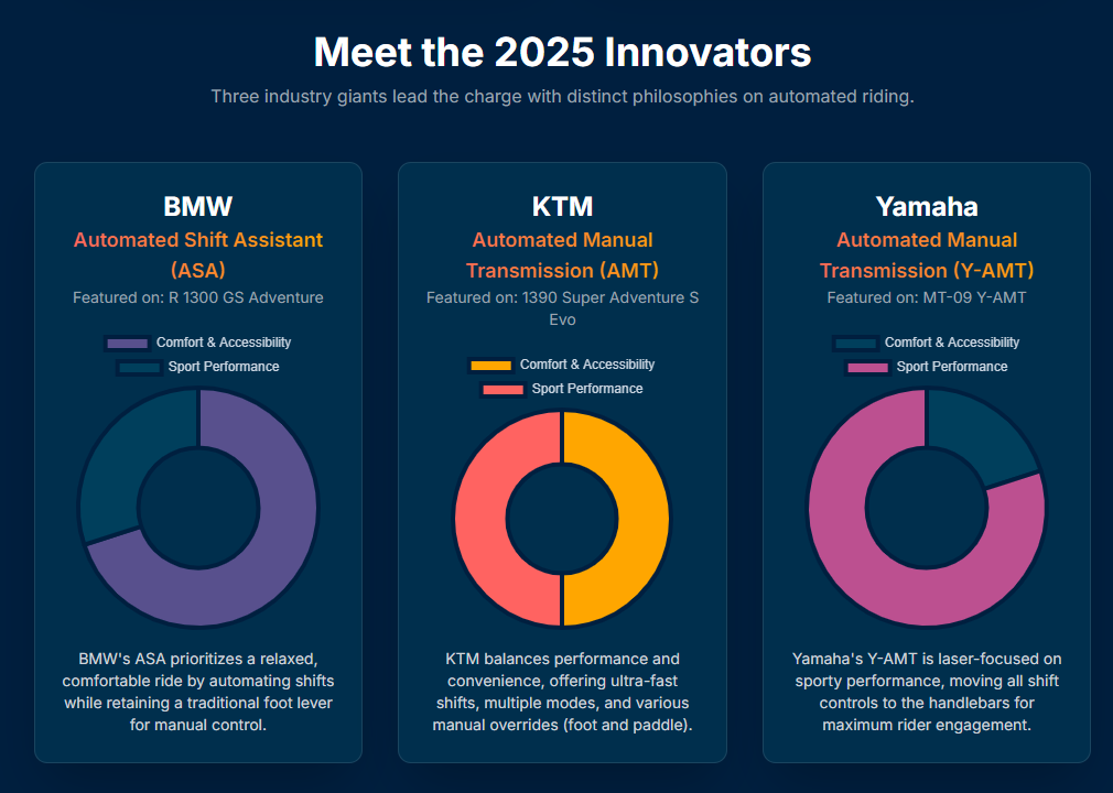BMW’s Automated Shift Assistant (ASA), KTM’s Automated Manual Transmission (AMT), and Yamaha’s Automated Manual Transmission (Y-AMT) all represent modern interpretations of automated shifting for motorcycles, yet they embody distinct philosophies in their technical execution and rider interface. All three systems fall under the broad category of “automated manual” transmissions, meaning they automate clutch actuation and offer automated gear selection, but they are not true Dual Clutch Transmissions (DCTs) or Continuously Variable Transmissions (CVTs) in the vein of Honda’s DCT or scooter applications.3