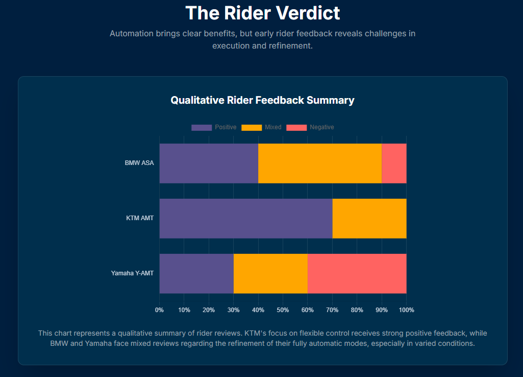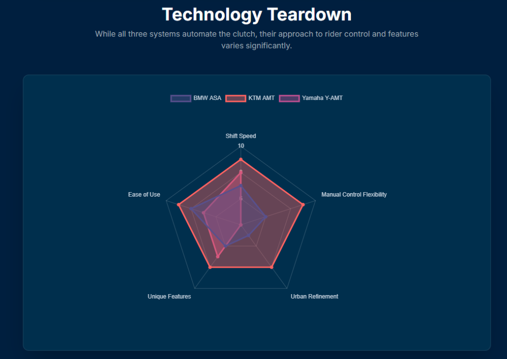 In essence, BMW’s ASA prioritizes comfort and simplified touring, with some compromises in shift refinement. KTM’s AMT seeks to integrate automation without sacrificing its performance heritage, offering extensive manual override. Yamaha’s Y-AMT innovates with a hand-centric interface for sporty riding, but faces challenges in urban refinement and fallback mechanisms.