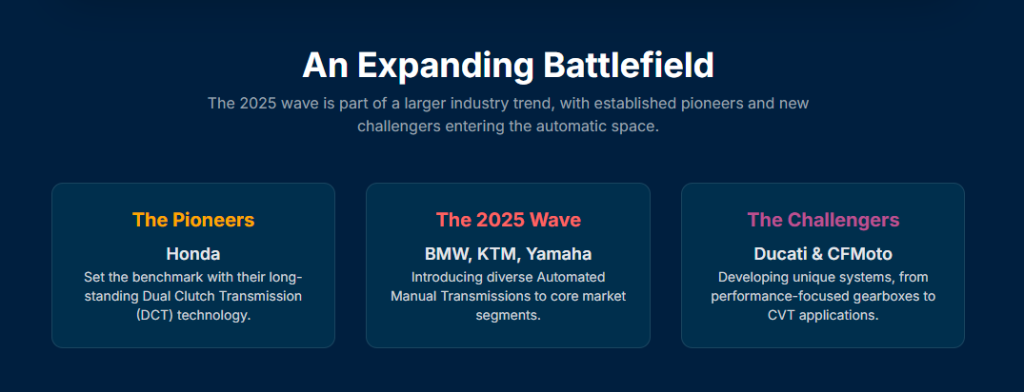 While BMW, KTM, and Yamaha are prominent players introducing new automatic transmission systems in 2025, the competitive landscape for automated motorcycles extends beyond these three manufacturers, indicating a broader industry trend.