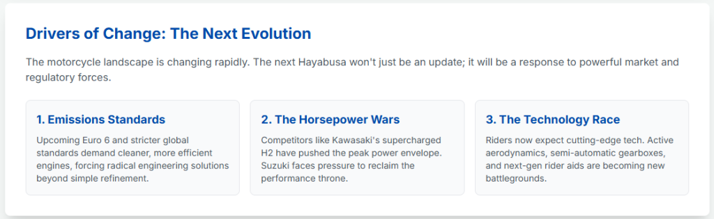 The next future of the Suzuki Hayabusa is not merely an incremental update; it is an engineering mandate driven by the need to neutralize competitive threats and comply with restrictive environmental regulations. The integration of variable valve timing and forced induction—likely supported by electronic anti-lag technology—transforms the legendary 1340cc engine into a unit capable of delivering 230 HP while achieving superior combustion efficiency. Paired with a lightweight chassis and the next evolution of S.I.R.S., the 2026 Hayabusa is set to redefine the performance benchmarks for the hyper-tourer segment, ensuring the peregrine falcon remains at the apex of speed and technology for the next decade.