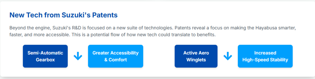 Achieving 230 HP closes the performance gap significantly with the 240 HP Kawasaki Ninja H2 7, while allowing Suzuki the engineering latitude to maintain the reliability margin necessary for a durable hyper-tourer. The application of forced induction technology is not expected to chase peak RPM figures, but rather to exploit the 1340cc displacement advantage by delivering a massive, lag-free surge of torque across the mid-range (7,000–9,000 rpm). This configuration enhances real-world tractability and acceleration, cementing the Hayabusa’s identity as the definitive hyper-tourer.