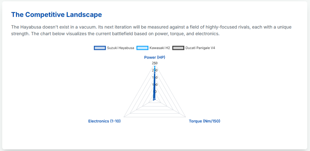 The hyperbike segment is defined by absolute velocity, high power-to-weight ratios, and supreme comfort over distance. While the current Hayabusa excels in stability and comfort, its 187 HP output has been surpassed by multiple rivals, shifting the competitive advantage to motorcycles utilizing forced induction or extreme, race-derived naturally aspirated engines.7 The current model’s electronically limited top speed of 299 km/h is matched by convention 3, but the sheer acceleration and power density required to reach that limit quickly are inferior when compared to its primary forced-induction rival.