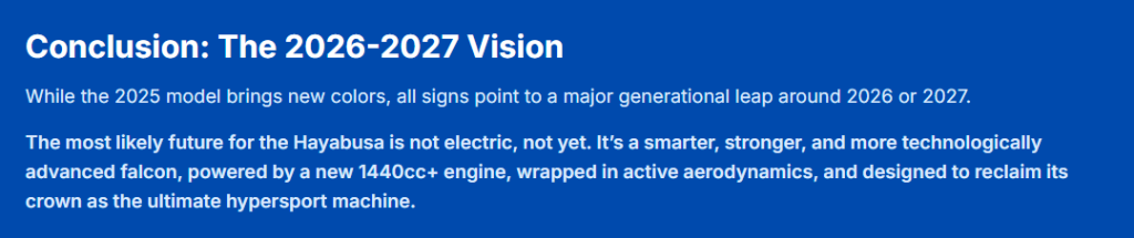 The production timeline remains consistent: the Gen 4 Hayabusa, designated as the 2026 Model Year, is expected to commence its global launch phase in late 2025.12 Additionally, the potential for a rumored “Hayabusa Final Evolution Edition” 12, featuring exclusive carbon fiber components and performance upgrades, suggests Suzuki may leverage this launch as an opportunity to celebrate the platform’s transition into the next era of high-performance motorcycling.