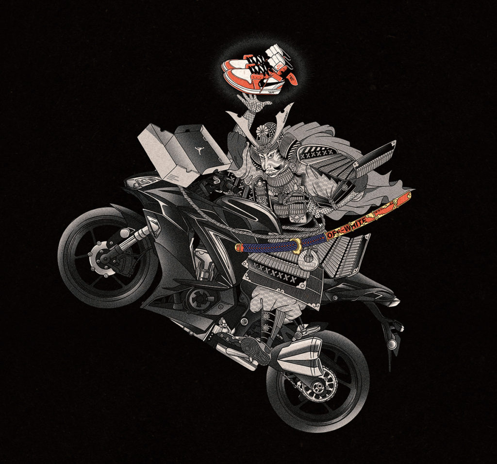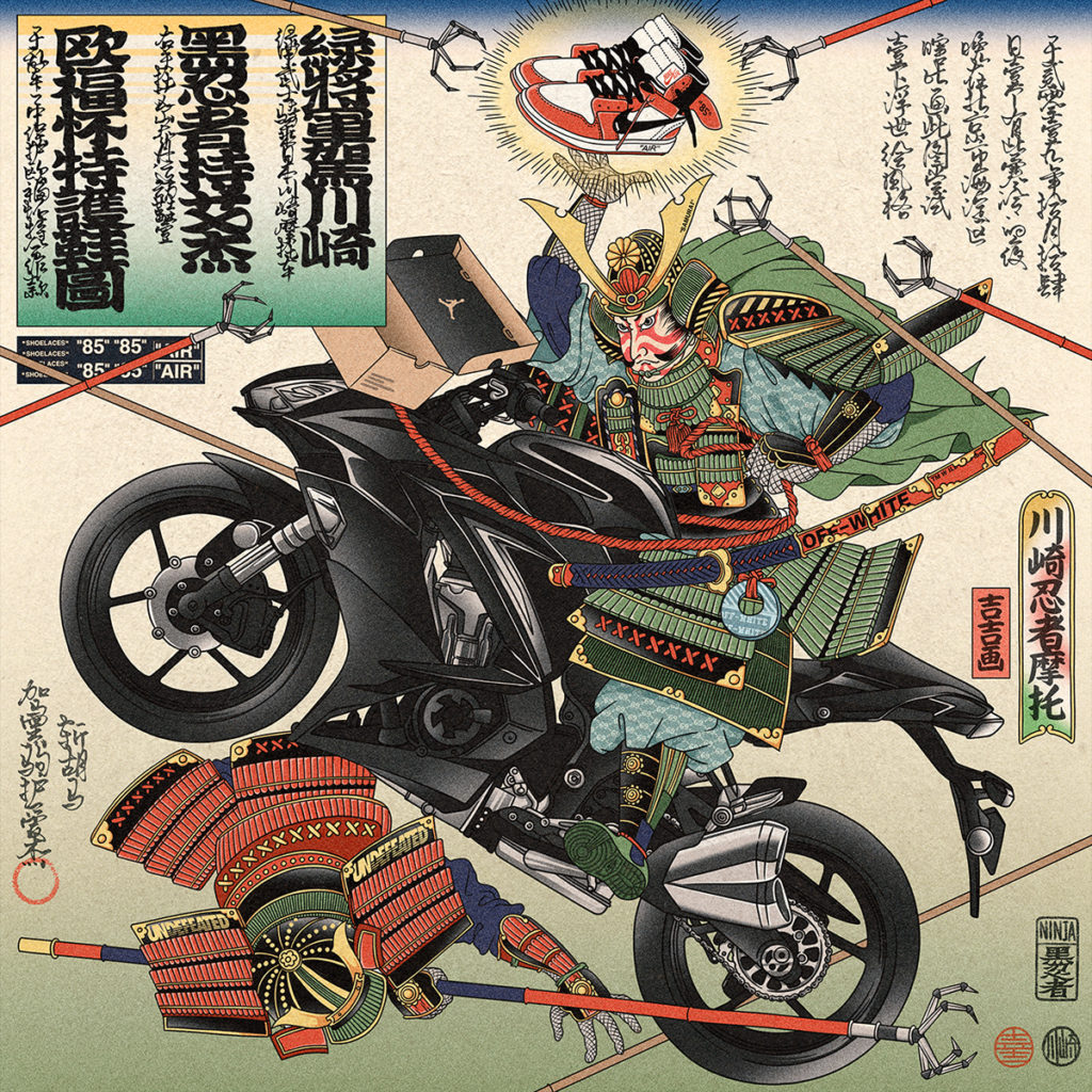 The most exciting part of looking at is the King, who is riding the Ninja 1000 carrying and protecting a pair of Air Jordans from other guarded soldiers, although there is only one soldier in this painting.