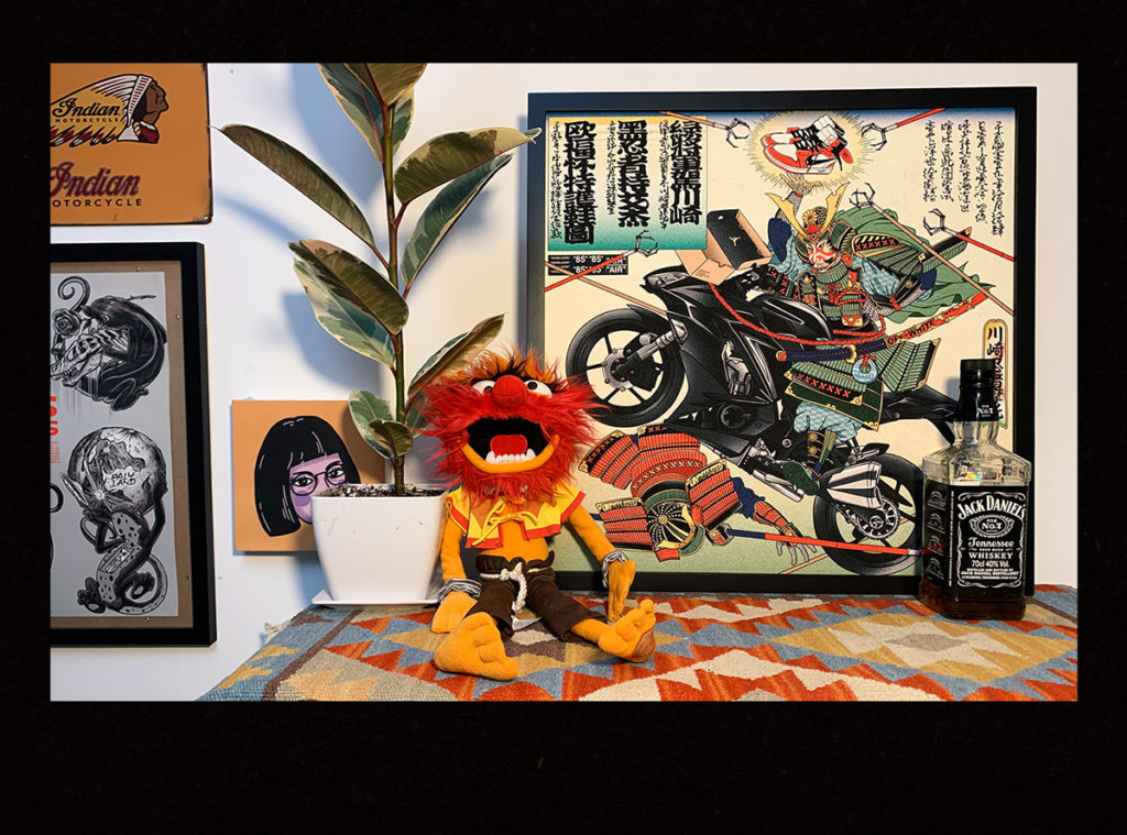 In the next photo, you see a puppet, a bottle of Jack Daniels, and the Riding King Ukiyo-e painting behind the puppet.