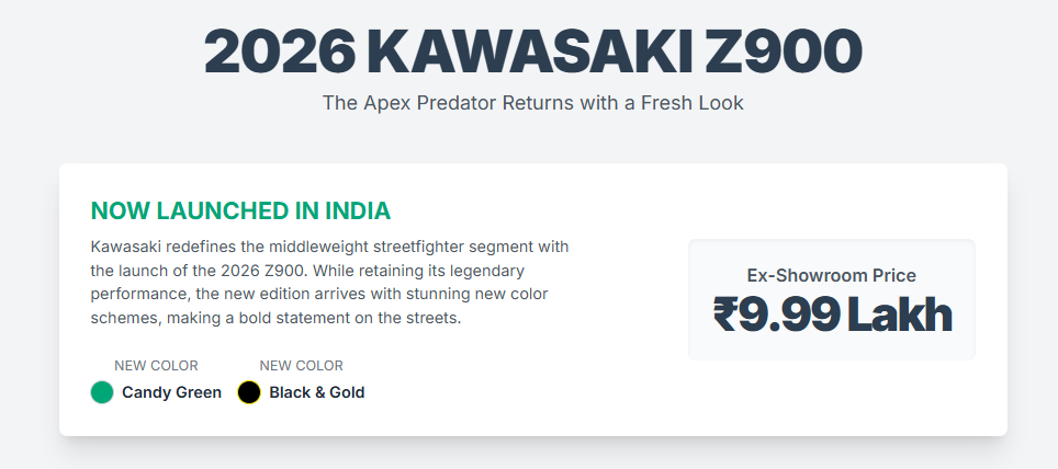 - 2026 Kawasaki Z900 launched at Rs 9.99 lakh – Autocar India, accessed October 18, 2025, https://www.autocarindia.com/bike-news/2026-kawasaki-z900-launched-at-rs-999-lakh-437892