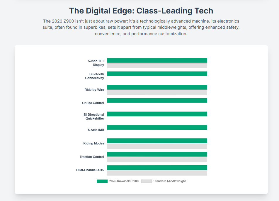 The 2026 Z900 maintains its established identity in the market. The continuity of the mechanical and electronic specifications signifies that the platform, having received a substantial technology injection in 2025 (including an IMU, ride-by-wire, and a bi-directional quickshifter), is deemed mature and competitive for the current market cycle.1 This approach minimizes re-homologation and R&D costs, allowing the brand to focus on pricing optimization.