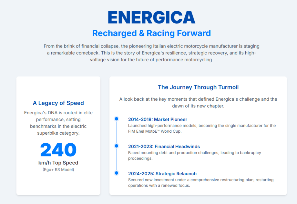 - Energica Sparks Back Into Life – British Motorcyclists Federation, accessed on September 15, 2025, https://www.britishmotorcyclists.co.uk/energica-sparks-back-into-life/