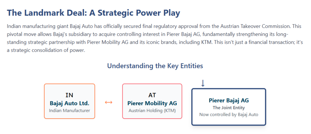 Bajaj Auto’s strategic decision to acquire definitive control over PIERER Mobility AG is a landmark move that capitalizes on a financial crisis to reshape the global competitive landscape of the premium motorcycle sector. By leveraging the urgent need for financial stabilization, Bajaj successfully navigated complex regulatory hurdles, securing the “restructuring privilege” from the Austrian Takeover Commission. This outcome is highly favorable, as it allows BAIH to transition from a powerful minority partner to a sole controlling owner without incurring the financial burden and timeline delays of a mandatory takeover bid for PMAG’s publicly traded shares.
