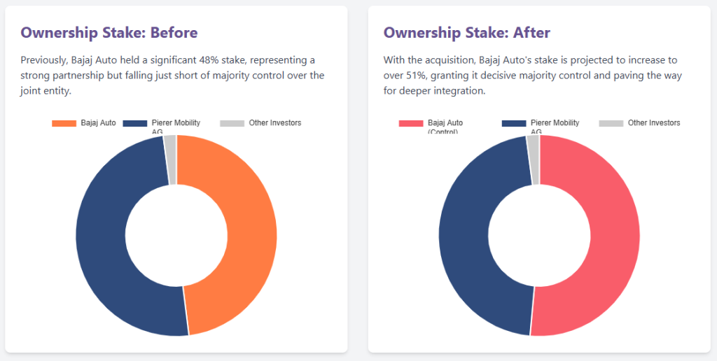 Before the transaction, control of PBAG was split: Pierer Industrie AG, owned by Stefan Pierer, held 51.1%, granting it control. Bajaj Auto International Holdings B.V. (BAIH) held the minority stake of 49.9%.1 Since PBAG holds a nearly 75% stake in PMAG, control over PBAG dictates operational control over the entire group.1