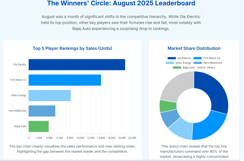 The table below details the competitive hierarchy based on August 2025 retail registrations (excluding Telangana data, consistent with some VAHAN reports, though the overall market size was approximately 1.04 lakh units).10