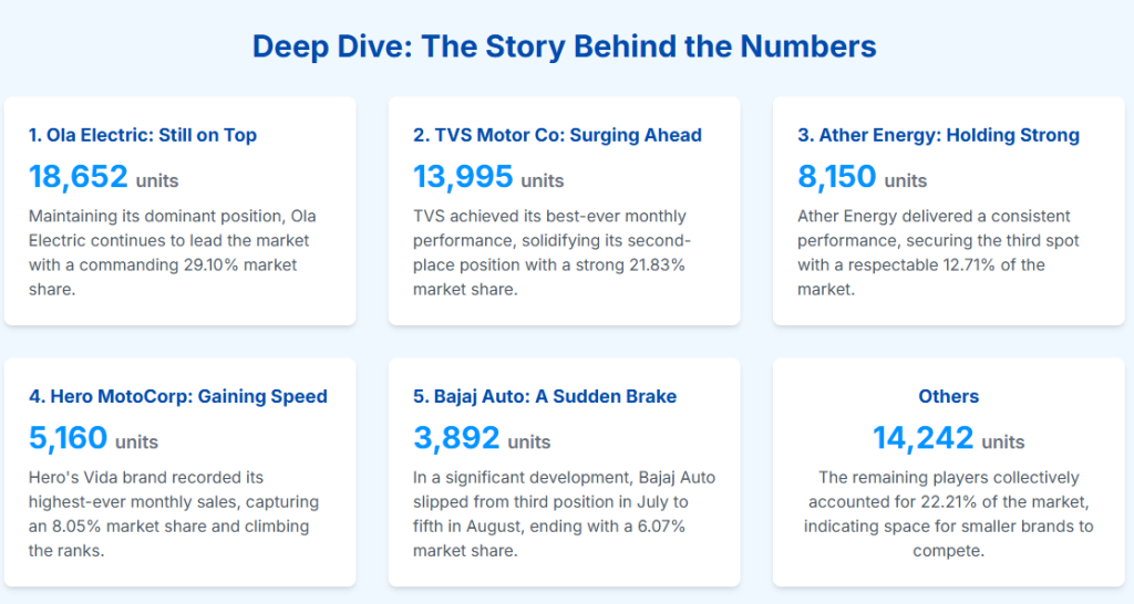 Perhaps the most significant development in August was Hero MotoCorp’s Vida brand surpassing Bajaj for the first time, registering 13,313 units.2 This moment confirms the shift from a three-way (TVS, Ola, Bajaj/Ather) contest to a fierce four-way battle, centered on affordability and access.