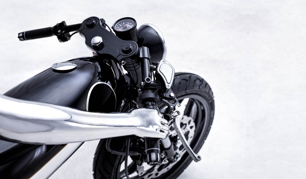 Silver color smooth clutch livers and black sports clip on adds a cafe racer look to this lightweight custom.