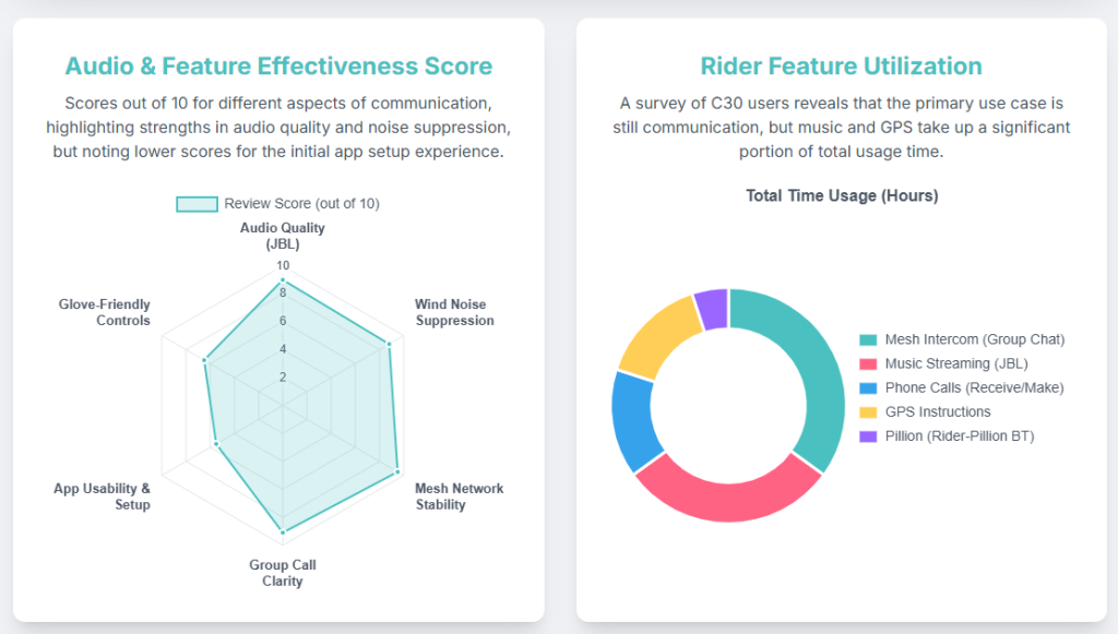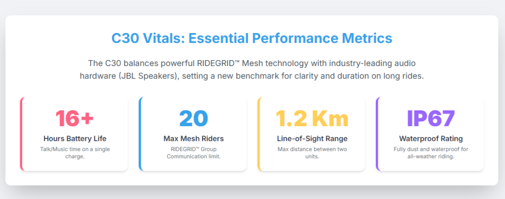 For riders primarily seeking superior audio, phone call clarity, and media consumption capabilities, the C30 is unequivocally recommended. The unmatched battery life (22–24 hours) and the ability to hold crystal-clear phone conversations at high speeds (up to 110 km/h) provide exceptional functionality that justifies the investment over cheaper, less capable Bluetooth units. The Mesh functionality, while present, is incidental for this profile, but the core performance characteristics are dominant.