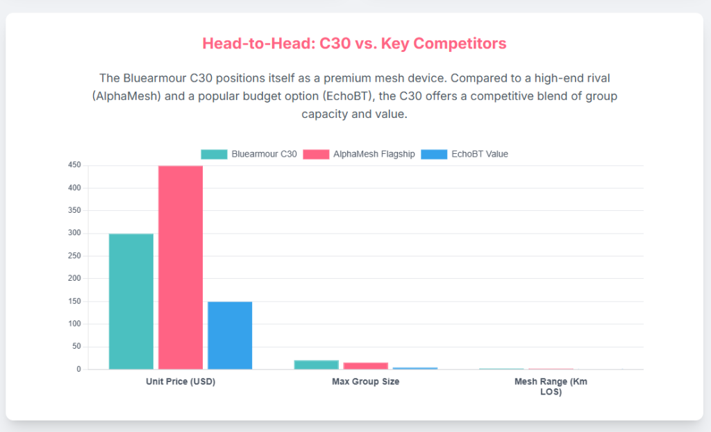 The C30 directly challenges the established hierarchy by providing core Mesh functionality (RIDEGRIDâ„¢) capable of supporting up to 20 riders.1 When benchmarked against premium systems, the C30 reveals a clear strategy of feature prioritization over experiential refinement.