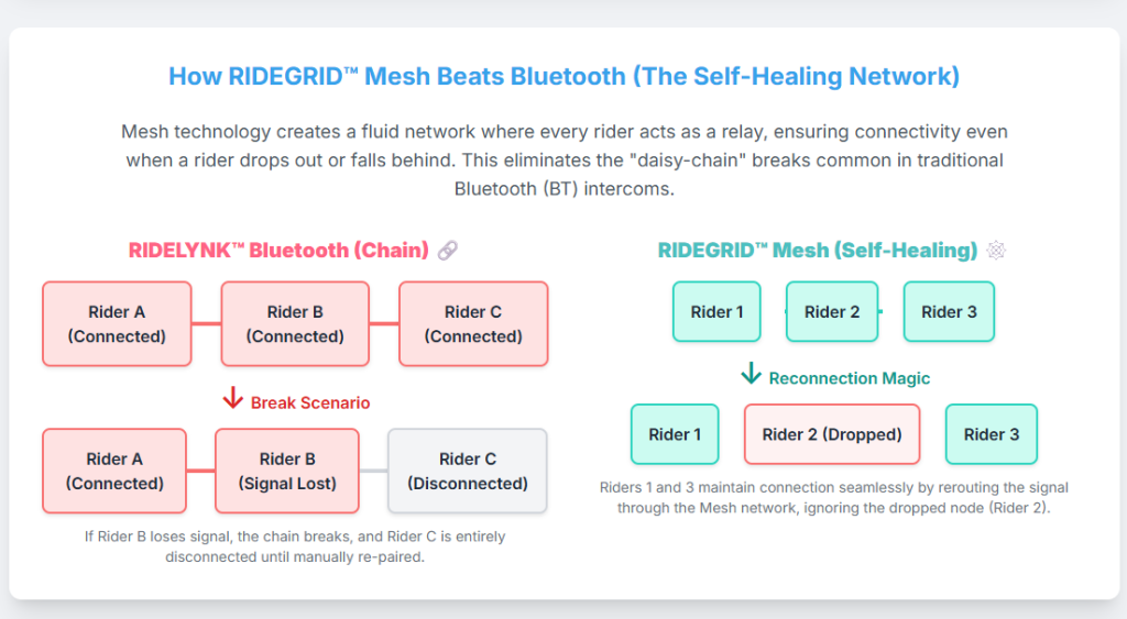 The centerpiece of the C30’s functionality is its proprietary RIDEGRIDâ„¢ Mesh Intercom Technology.1 Mesh networking is essential for large group riding because it creates a decentralized, self-healing network, eliminating the linear chain vulnerability inherent in traditional Bluetooth pairing. RIDEGRIDâ„¢ supports a substantial group capacity, connecting up to