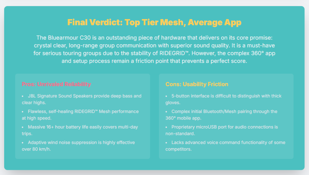 The Bluarmor C30 offers a compelling value proposition. It successfully integrates core premium features—Mesh communication, exceptional battery endurance, and superior high-speed voice clarity—at a price point accessible to the mass market. The device is a strong recommendation for touring enthusiasts and groups prioritizing power efficiency and essential group communication. However, potential adopters must acknowledge the usability friction introduced by the physical controls and the current instability of the companion software. The C30 provides highly advanced functionality packaged within an ergonomically average enclosure.