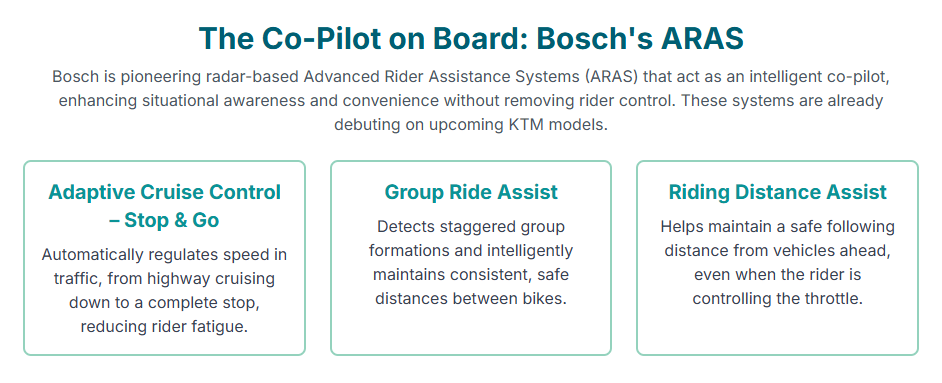 KTM is serving as a key launch partner for these next-generation Bosch ARAS systems, primarily integrating the technology into its high-end Adventure and Sports Tourer segments.8 For instance, the 2025 KTM 1390 Super Adventure S lists “Front Radar” as optional technology, indicating the platform readiness for these features.13