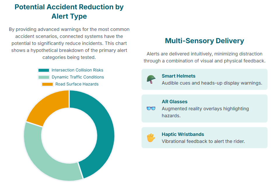 A core challenge in deploying C-ITS for motorcycles is designing a Human Machine Interface (HMI) that effectively delivers critical information without imposing excessive cognitive load. The research team tested multi-modal alert systems, including alerts delivered via smart helmets, augmented-reality (AR) glasses, haptic wristbands, and LED lights.20 AR head-up displays (HUDs) overlaid information like navigation and collision warnings directly onto the rider’s visual field.23 Haptic wristbands provided tactile (vibratory) warnings, using a non-visual, non-auditory channel.22