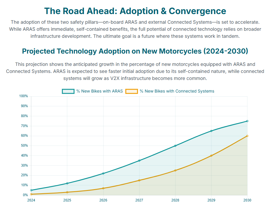 The future of motorcycle safety involves the architectural convergence of ARAS, C-ITS, and Artificial Intelligence (AI). AI is already integral to existing ARAS algorithms, analyzing sensor data from IMU and radar to optimize intervention timings and predict potential failures.19