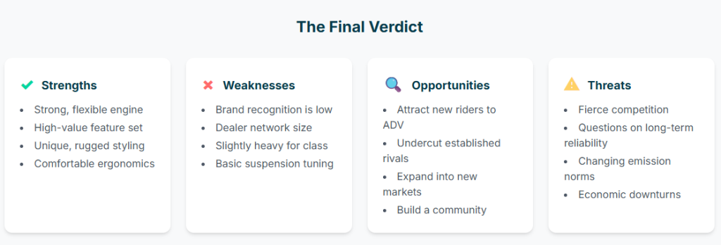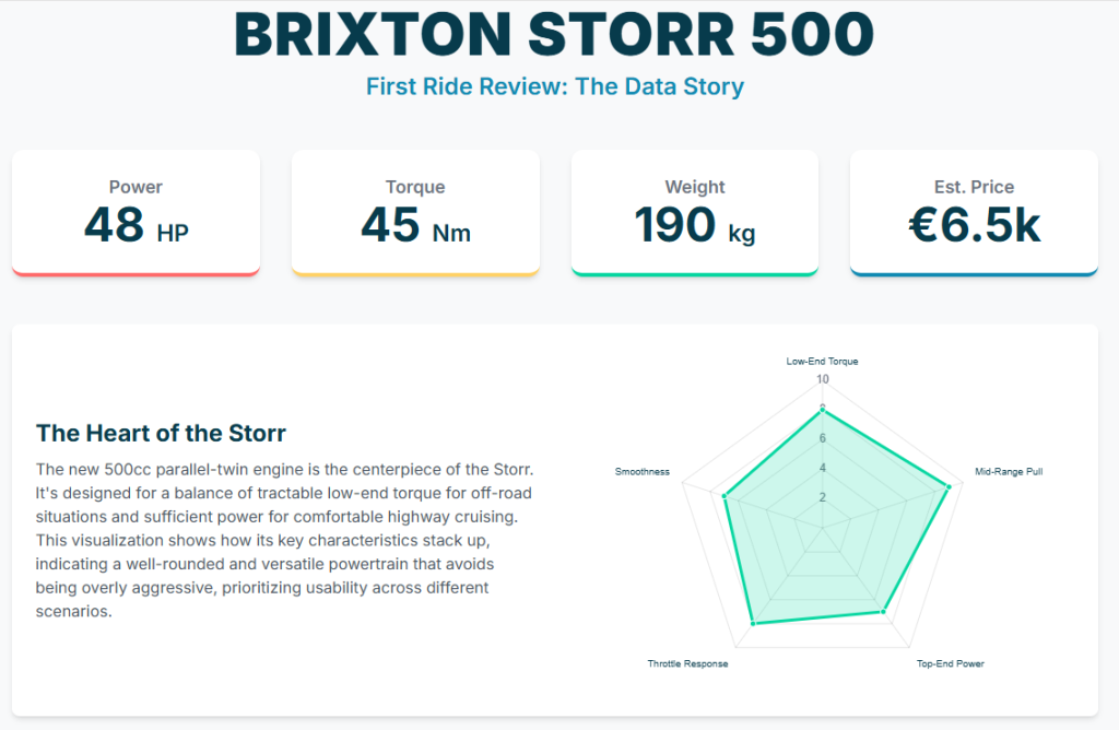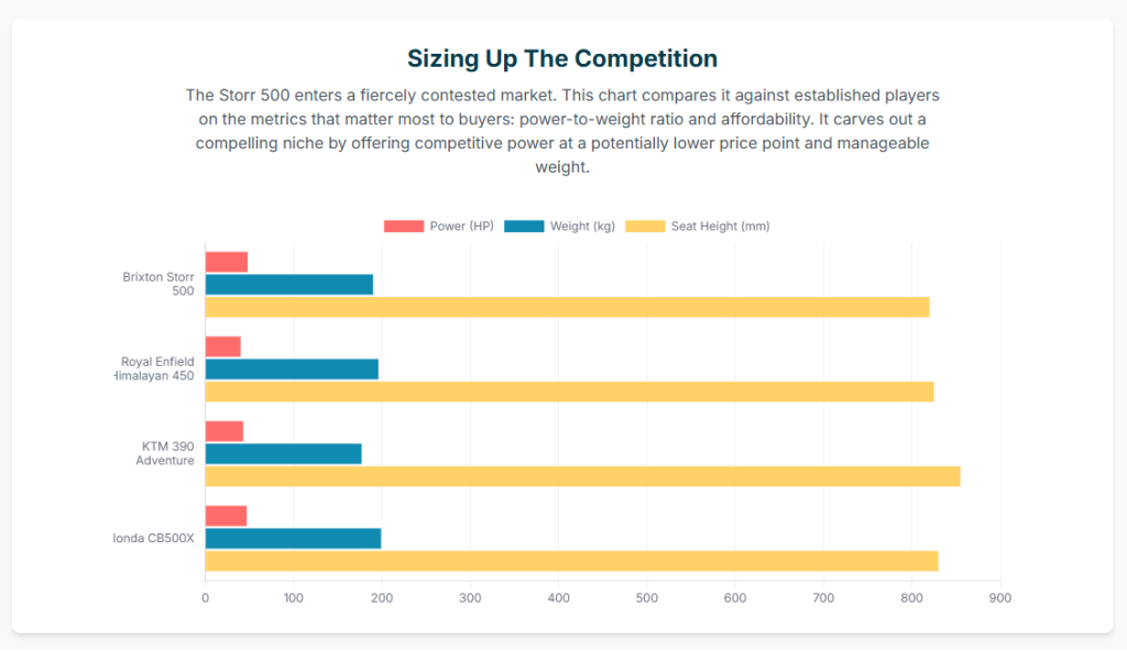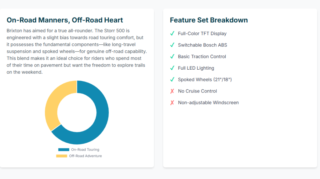 The Brixton Storr 500 enters the adventure market as a highly credible and strategically positioned contender. Its strengths are deeply rooted in its mechanical specification and visual presence.