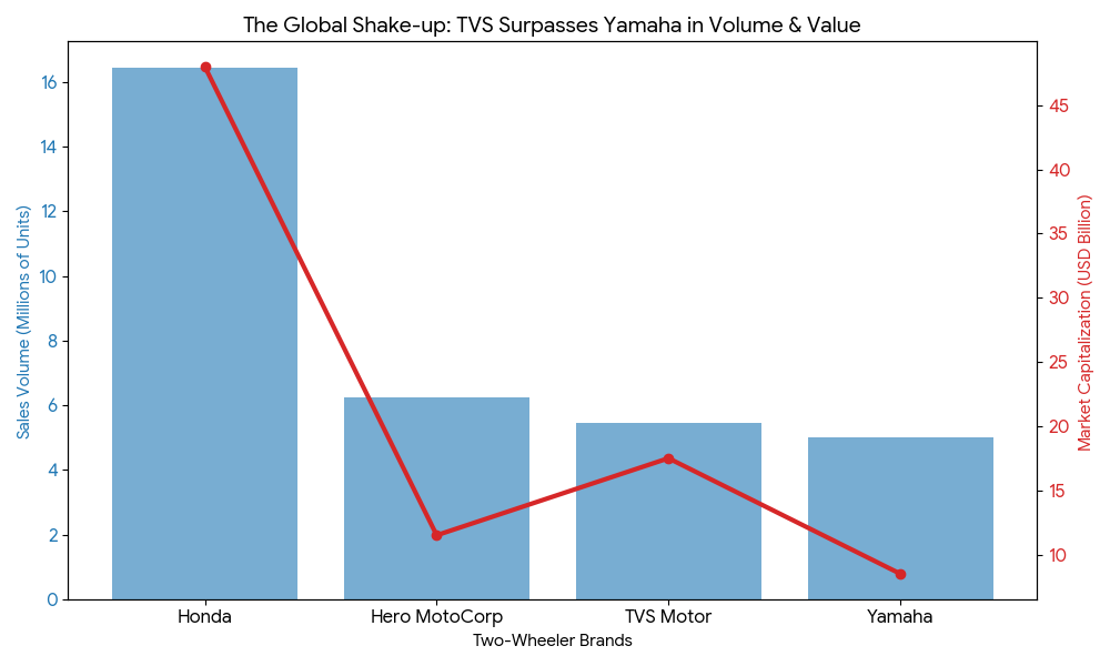 - The Value Gap: Not only did TVS beat Yamaha in volume, but they are also winning the “Value War.” TVS’s Market Capitalization (approx. $17.5 Billion) is now nearly double that of Yamaha Motor’s (~$8.5 Billion), making it one of the most valuable two-wheeler companies on the planet.