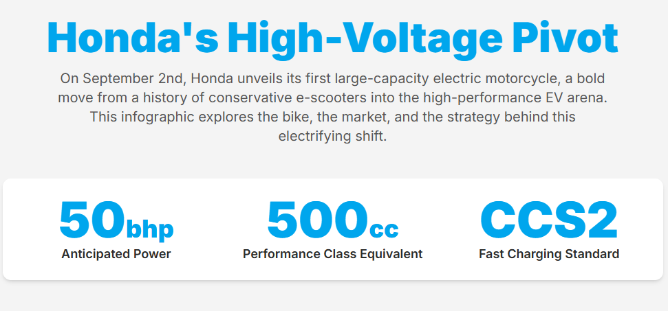 Honda is set to conduct a global unveiling of its new electric performance motorcycle on September 2nd.12 This event is highly anticipated, marking a pivotal moment as Honda makes a definitive entry into the large-capacity electric motorcycle segment, moving beyond its current emphasis on smaller electric scooters . This precise timing, coupled with the emphasis on a “large-capacity” model after a period of “playing safe with e-scooters” , signifies Honda’s deliberate intent to capture significant market attention and establish a strong presence in the premium EV motorcycle space. This is more than just a product launch; it is a strategic declaration to the entire automotive industry and consumers about Honda’s committed future direction in electrification.