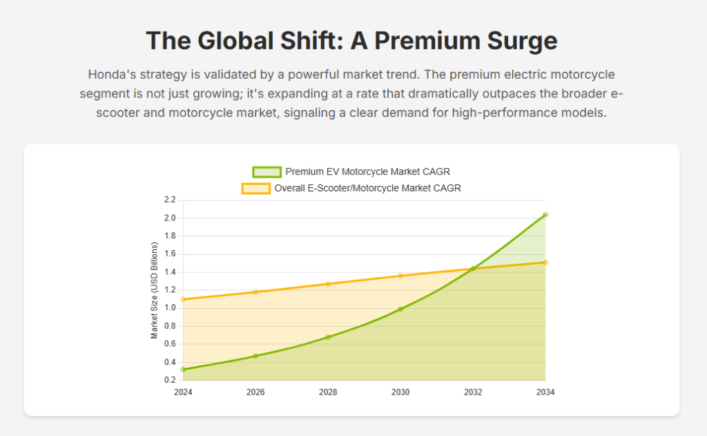 This strategic alignment mirrors a broader trend observed in the traditional ICE motorcycle market, where premium segments are demonstrating resilience and growth, even as economy segments face downturns.2 This strategic shift by a global automotive powerhouse like Honda is likely to have a ripple effect across the industry, potentially accelerating the overall development and adoption of performance electric motorcycles and compelling other major original equipment manufacturers (OEMs) to intensify their efforts in this space. Such a move could also validate the segment for a wider consumer base, fostering greater confidence in the viability and appeal of high-performance electric two-wheelers.