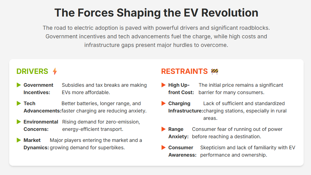 - Market Dynamics: Increasing interest from established two-wheeler market players entering the EV space, coupled with the emergence of innovative electric motorcycle startups, is stimulating market growth.16 There is also a growing demand for powerful superbikes among younger demographics.19