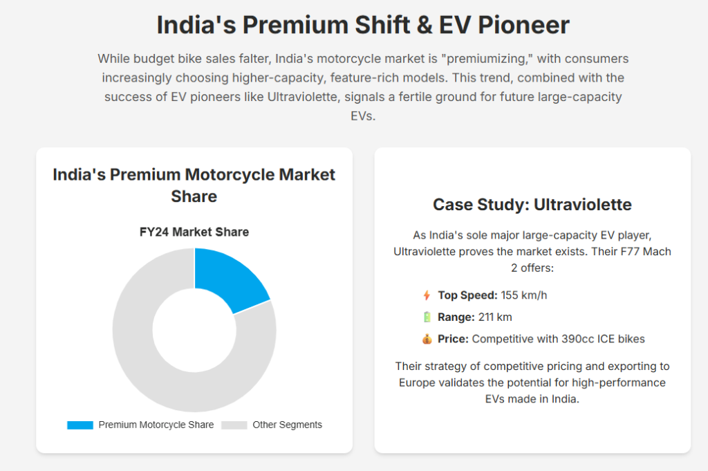 This dual-market dynamic presents both challenges and opportunities for large-capacity electric motorcycles. While the overall Indian market faces headwinds for budget bikes, the growing premium segment demonstrates a willingness among a segment of consumers to invest in higher-value products. This creates a long-term opportunity for large-capacity EVs, provided manufacturers can navigate the initial price barriers and develop a supportive charging ecosystem. The success of players like Ultraviolette in this nascent premium EV space further underscores this potential.