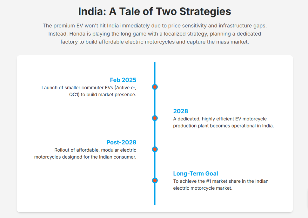 An immediate launch in India is deemed “unlikely”, primarily due to the nascent market for large-capacity EVs and the prevailing price sensitivity among Indian consumers. Currently, Ultraviolette is the only significant player in India’s large EV segment , though the e-motorcycle segment is projected for substantial future growth.11 Honda’s long-term strategy for India includes establishing a dedicated EV motorcycle production plant by 2028.1 This plant aims to produce more affordable electric motorcycle models and secure a leading market share, indicating a phased and localized approach to the Indian market. This approach acknowledges that the Indian market is not yet ready for premium EVs due to price and infrastructure, necessitating a phased approach that prioritizes cost-effectiveness and local needs, contrasting with the global premium offering.