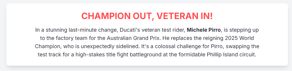 2. Ducati test rider Pirro to replace injured Marquez at Australian Grand Prix | The Straits Times, accessed on October 11, 2025, https://www.straitstimes.com/sport/Ducati-test-rider-Pirro-to-replace-injured-Marquez-at-Australian-Grand-Prix