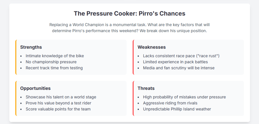 The primary risk for Ducati is not a poor finish, but a catastrophic incident.7 Phillip Island is fast and unforgiving, and the lack of full race rhythm at maximal lean angles and high speed drastically increases the chance of a crash, particularly in rapid direction changes.20 Pirro’s career retirement rate stands at 17.33%.12 Avoiding this outcome, which would result in the loss of critical development data and potential damage to the sophisticated GP25 chassis, is the overriding concern.