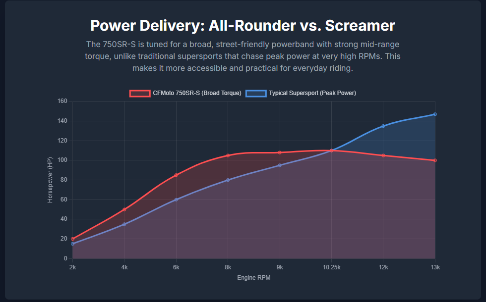 The engine is paired with a 6-speed transmission.1 In terms of outright performance, CFMoto claims a 0-100 kph acceleration time of just 3.3 seconds 2 and a top speed exceeding 230 km/h.3 While a 750cc inline-four, the engine is noted as “not your usual four-pot screamer”.13 Its peak power is achieved at a relatively lower RPM (10,250 rpm) compared to traditional Japanese 750cc inline-fours, such as the Suzuki GSX-R750 which peaks at 12,200 rpm.1 This characteristic suggests a deliberate tuning for broader, more accessible power delivery rather than a high-revving, track-focused peak. The focus appears to be on a street-friendly powerband with strong mid-range torque, making it more practical for everyday riding while still offering thrilling acceleration.