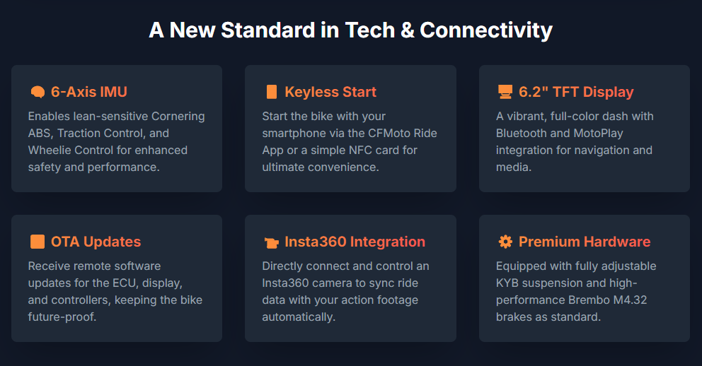 The extensive suite of connectivity and smart features, particularly the smartphone-based key, OTA updates, and Insta360 integration, highlights CFMoto’s forward-thinking approach. This goes beyond merely adding features; it involves creating an integrated digital ecosystem around the motorcycle. OTA updates future-proof the bike, allowing for performance improvements and new features post-purchase, a capability that remains uncommon in this segment. The Insta360 integration directly caters to the modern rider’s desire for content creation and sharing. The T-Box module serves as the central nervous system for this ecosystem, hinting at even more advanced telematics and safety features in the future. This strategy positions CFMoto as a technologically advanced brand, appealing to a younger, digitally native demographic and potentially setting new industry standards for connectivity in middleweight motorcycles.