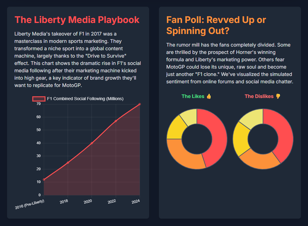Furthermore, Red Bull’s brand strategy, developed under Horner’s direction, was defined by its “edgy” and non-conformist approach, adopting flexible strategies depending on competitive necessity.41 This risk-taking, disruptive management philosophy is a direct cultural fit for the aggressive growth mandate Liberty Media must impose on the often more traditional MotoGP establishment, particularly concerning digital marketing and content creation strategies.12
