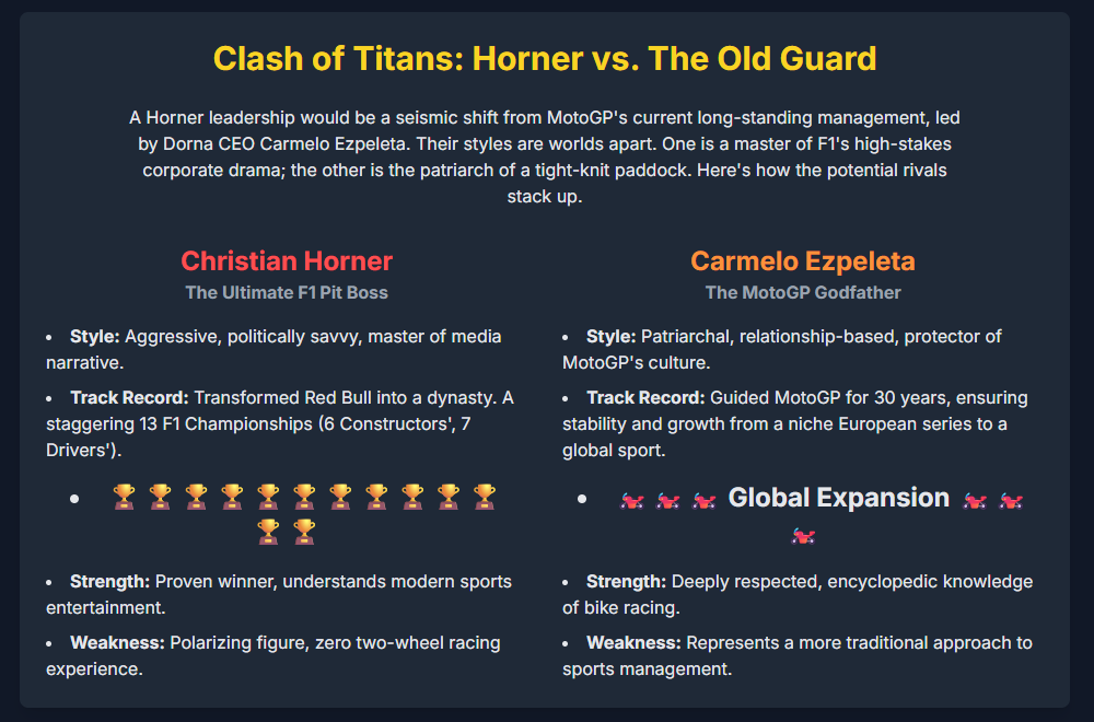 - Strategic Compulsion: Liberty Media needs a high-profile, commercially proven disruptor ready to execute the F1 blueprint on two wheels. Horner is precisely this type of high-risk, high-reward executive.