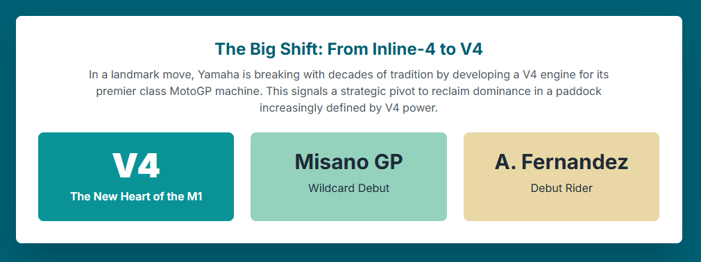 The unveiling of Yamaha’s new V4-powered YZR-M1 prototype at the Misano World Circuit Marco Simoncelli marks a profound and necessary strategic pivot for the manufacturer. This report provides a comprehensive analysis of the factors compelling this shift, the technical advancements it represents, and the long-term implications for Yamaha’s future in motorcycle racing.