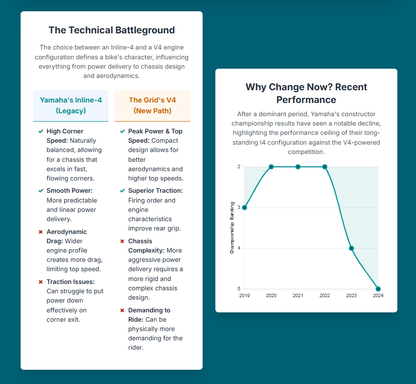 For over two decades, Yamaha has been synonymous with its inline-four engine, a configuration that delivered eight riders’ titles and 125 Grand Prix wins.1 However, a widening competitive gap, evidenced by a slide to a “D ranking” in the constructors’ standings and a two-year winless streak, has rendered the traditional inline-four platform unsustainable.1