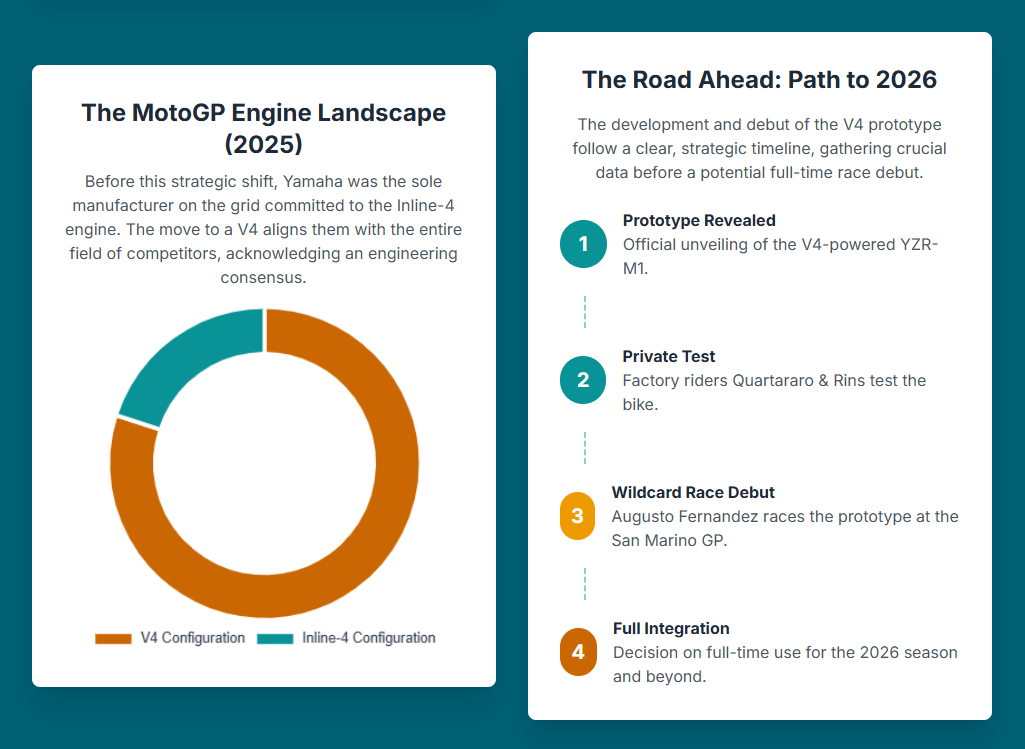 This isn’t merely an engine swap; it’s a fundamental reimagining of the entire motorcycle. Yamaha’s leadership has confirmed the new V4 prototype is a “coherent package” where power delivery, chassis balance, and aerodynamics have all been “tuned as a system”.6 The inherent design of the V4, with its ability to shift weight distribution more toward the rear tire, directly addresses the inline-four’s persistent issues with converting power into effective traction and acceleration.1 This integrated approach is a direct acknowledgment that modern MotoGP success is not based on a single element but on the seamless synergy between the engine, chassis, and aerodynamic package. The V4 is the foundational architecture that makes this “coherent package” possible.