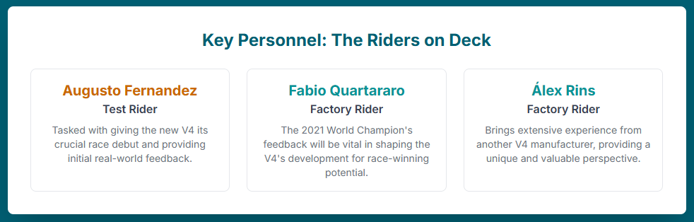 Furthermore, the project is critical for retaining top talent. The commitment to a radical new development path was a key factor in securing Fabio Quartararo’s contract extension, a move that would have been unlikely without a clear sign of renewed ambition from the manufacturer.7 Similarly, the project’s scope and potential have convinced test riders Augusto Fernandez and Andrea Dovizioso to extend their contracts through 2027.3 Their continued involvement underscores the perceived importance and viability of “Plan V” and ensures continuity in the development of both the 1000cc V4 and the future 850cc platform.
