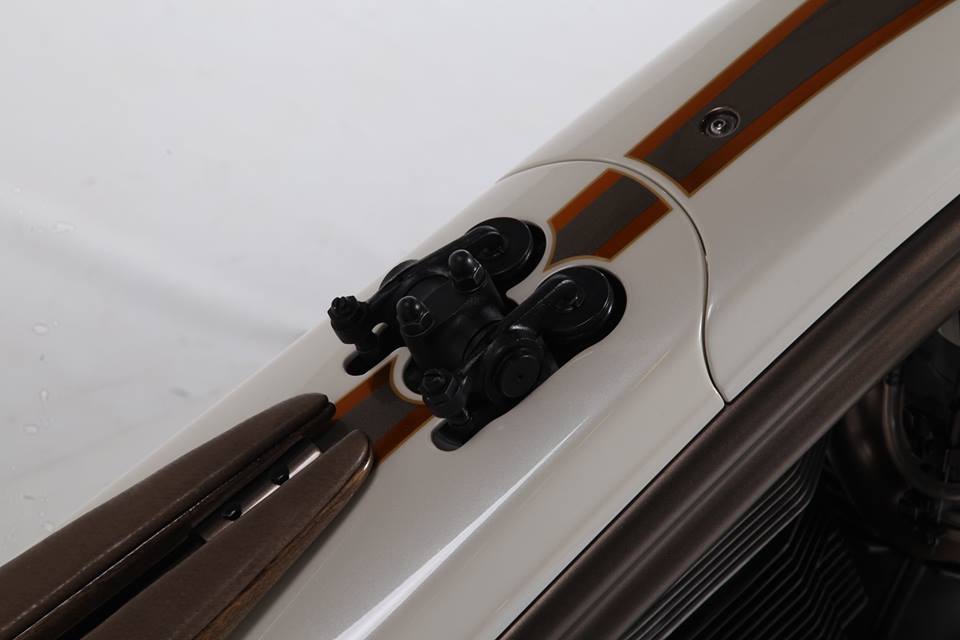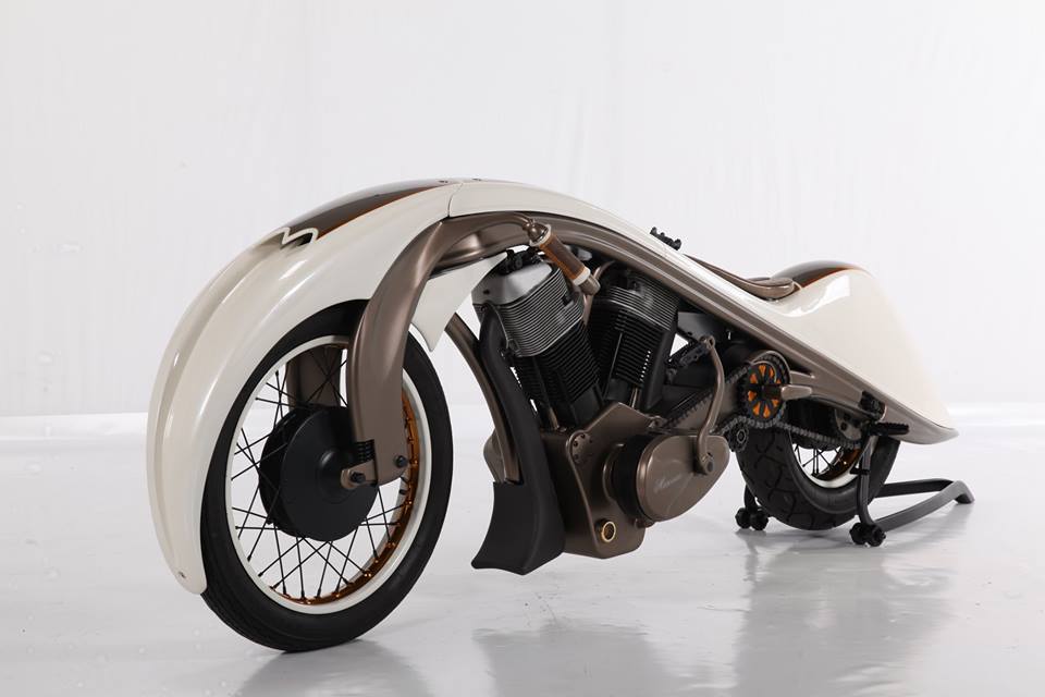 Two color paint scheme is used in-order to make the work look more artistic. A dark brown paint scheme and cream color paint that neatly went with this work. Also the clutches were made by Karoly himself.Exhaust looks well integrated with the machine.