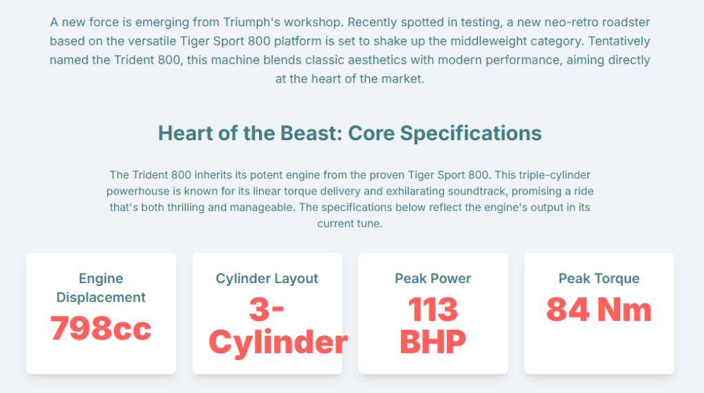 The strategic positioning of the Trident 800 is a key element of its potential success. It is not designed to be an internal competitor to the high-performance Street Triple 765. Instead, it is being positioned as a neo-retro, style-focused alternative. While the Street Triple is built for aggressive, track-oriented performance with its high-revving engine and premium componentry, the Trident 800 will offer a more user-friendly, torque-rich power delivery and a more relaxed, street-oriented riding posture. This deliberate differentiation is a sophisticated method of market segmentation, ensuring that each model caters to a distinct rider demographic.
