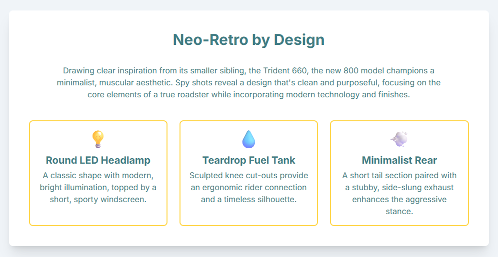 The visual identity of the Trident 800 prototype is a deliberate echo of the Trident 660’s design philosophy. The spied motorcycle’s round LED headlamp, teardrop tank, and minimalist tail section are all signature elements of the smaller Trident.1 This consistency in styling is not merely a design choice; it is a strategic branding decision. The name “Trident 800” itself signals that this motorcycle’s primary identity is a more powerful variant of the existing neo-retro line, rather than a sibling of the aggressive, performance-focused Street Triple.