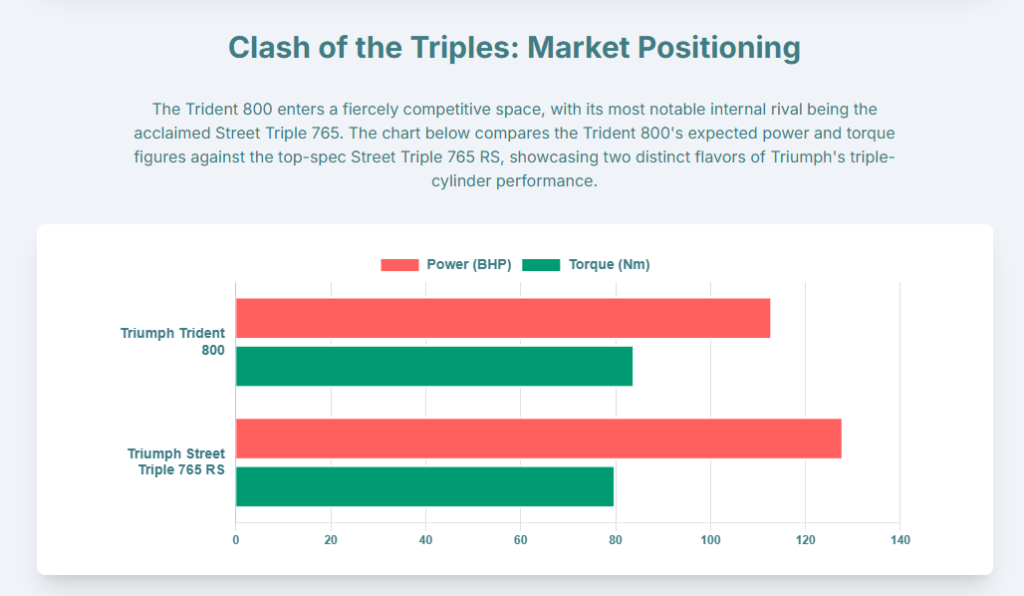The user query raises a critical point about the potential overlap between the Trident 800 and the Street Triple 765 due to their similar power outputs. A direct comparison reveals that while their peak horsepower figures are close, their fundamental design philosophies are entirely different, a distinction that eliminates the potential for internal competition.