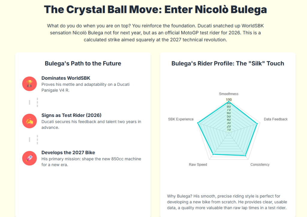 Ducati’s decision to elevate Nicolò Bulega to test rider status is not about replacing its current structure, but about creating a specialized, dual-pronged R&D assault force perfectly balanced between maintaining current dominance and engineering future success.